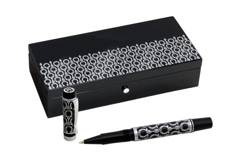 Ручка роллер «Подкова» в подарочной упаковке из дерева (серебристое покрытие черная заливка). 220х100х15 мм.